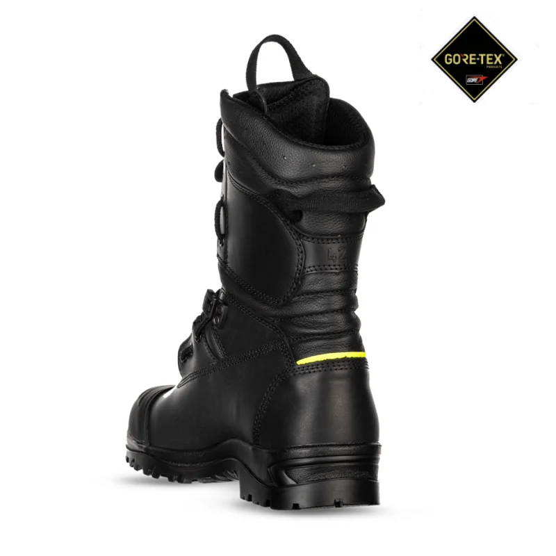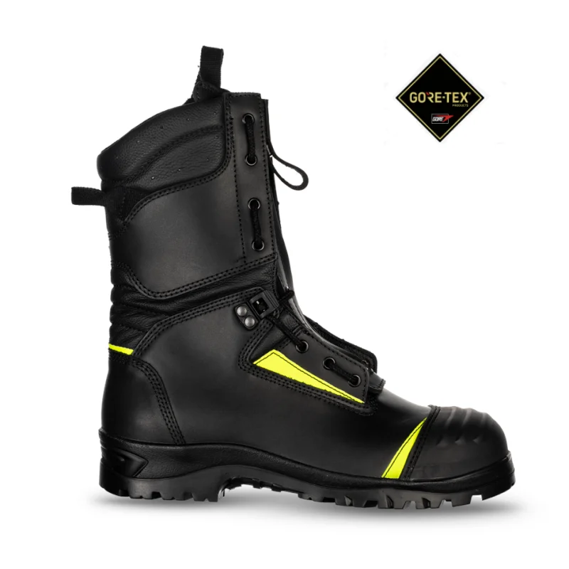 Buty dla strażaków z innowacyjną konstrukcją wierzchów, która zapewnia większą wygodę przy użytkowaniu, wyższe parametry ochrony i widoczny, unikalny design. Nacisk kładzie się na funkcjonalne wzornictwo, łącząc atrakcyjny wygląd z bardzo dobrym komfortem i ochroną. Cholewka jest wykonana ze skóry naturalnej i ma gumowy ochraniacz palców, aby zwiększyć trwałość. Konstrukcja zawiera spoiler w obszarze kostki, który chroni tę część stopy przed uderzeniem. Obuwie obejmuje elastyczną strefę, która umożliwia swobodny ruch nogi i stopy, ułatwiając prowadzenie lub klęczenie. Obuwie obejmuje system zapinania na suwak YKK i sznurowadła NOMEX, które mają dwustrefowe ściąganie, dzięki czemu każdy może dostosować swoje buty do własnych potrzeb. Podeszwa zewnętrzna jest wykonana z wytrzymałej, odpornej na olej i paliwo mieszanki gumowej o doskonałych właściwościach ścinania. Zawiera stalową wkładkę, która zapobiega przekłuciu ostrymi przedmiotami od dołu. Kompleks podeszwy izoluje ciepło i zimno, ma właściwości antystatyczne i ma ząb w pięcie, co zapewnia wygodne dopasowanie. Palce stopy są zabezpieczone stalowym podnoskiem. Na cholewce jest wystarczająco dużo elementów odblaskowych, które są widoczne nawet wtedy, gdy noga zakrywa goleń. Ponadto but jest wyposażony w podszewkę membranową GORE-TEX, która zapewnia wyjątkowo wysoką i trwałą ochronę stóp przed wilgocią z zewnątrz.