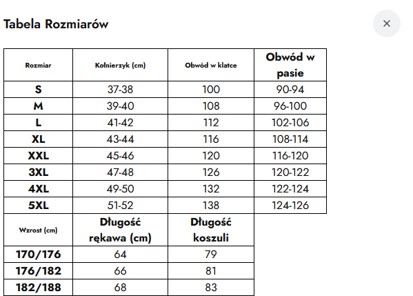Rzeczywiste wymiary koszuli podane w tabeli rozmiarów, tkanina jest lekko naciągliwa co czyni ją wygodniejszą w użytkowaniu.