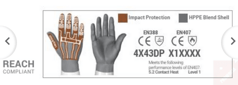 Normy: EN 388:2016 (4X43DP), EN 407 (X1XXXX)