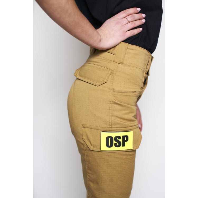 • Spodnie koszarowe posiadają dwie duże kieszenie boczne oraz dwie kieszenie tylne zamykane na rzep. Pas jest regulowany na rzep. Rozporek zapinany jest na zamek spiralny oraz dodatkowy rzep. Nogawki spodni są regulowane na rzep i mogą być stosowane zarówno z półbutami, jak i z obuwiem koszarowym wysokim. Na bocznych kieszeniach umieszczone są oznaczenia OSP w kolorze żółtym, a wszystkie szlufki w spodniach są wzmocnione przed wyrywaniem specjalnym ryglem.