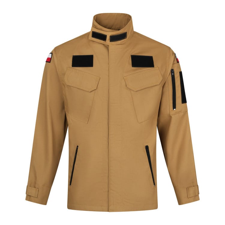 Ubranie koszarowe jest w kolorze piaskowym, a krój nadaje mu unikalny design i jest dopasowany do potrzeb użytkownika, co zapewnia wygodę noszenia i swobodę ruchów.