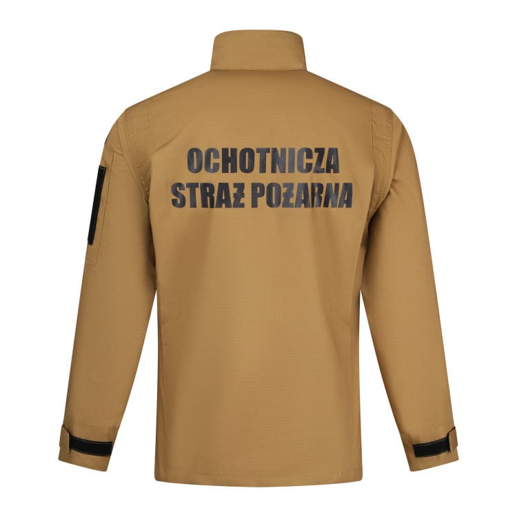 • Bluza koszarowa wyposażona jest w pięć kieszeni, z czego trzy zamykane są na zamek, a dwie na rzep. Dodatkowo, na lewym ramieniu znajduje się jedna kieszeń na zamek. Bluza zapinana jest na zamek spiralny, a mankiety regulowane są na rzep. Rzepy w bluzie znajdują się w stójce kołnierzyka, po jednym nad prawą i lewą kieszenią piersiową oraz na lewym ramieniu bluzy, który idealnie nada się na umieszczenie na nim emblematu jednostki. Na prawym i lewym ramieniu umieszczone są flagi Polski, natomiast na plecach umieszczony jest napis „Ochotnicza Straż Pożarna” w kolorze czarnym.
